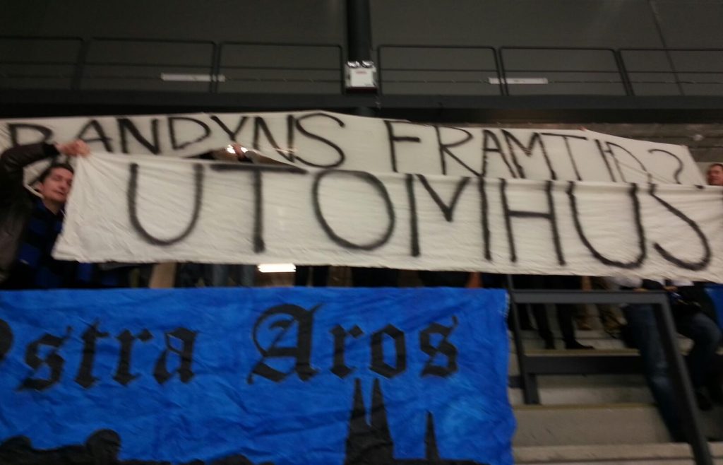 Efter inbetalad entrépeng och intagen, oskottad bortasektion med dittejpad Östra Aros-banderoll fick vi åtminstone bevittna två hela 3×30-perioder. Inte alla av oss dock. Nio minuter in i den här perioden, vid oförändrad ställning, avstannade spelet för diskussion om fortsatt spel. Och fortsatt spel och tittande (hejande) blev det, men inte för alla av oss. En av våra som vid konferensen höll i ett värmande pyrotekniskt föremål fick prata med Söderhamns konstapel och i samråd med denne lämna arenan och sätta sig i minibussen. Efter ett tag hör vi dock Sirius-relaterade skrik komma från något skogsparti och det visar sig vara vår utslängde kamrat, som där någonstans hittat ett titthål att följa matchen från och denne kämpe lyckas även där göra sig hörd. Han vittnar om blå-svart dominans på läktaren, trots att vi bara var ett drygt handfulla där, dessutom utan tak som akustiskt stöd eller för den delen skydd från den sjuka snöstormen som rådde.